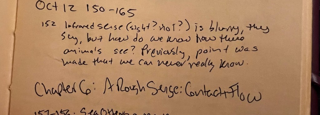 This week’s reading from An Immense World covered a lot of ground, from continuing explorations into how animals perceive color, to ambitious and thought-provoking studies of pain across the animal kingdom, to sensations of heat, cold, and touch. It’s hard to believe so much information could be relayed in just ninety pages!